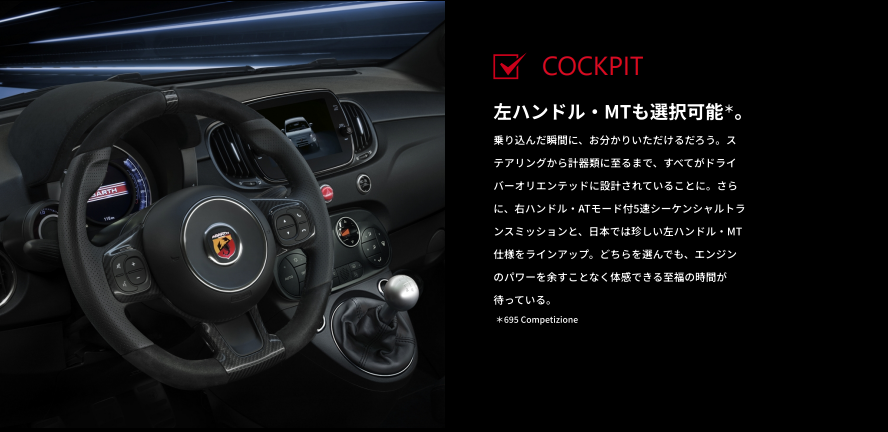 最高のドライブミュージックを標準装備した『695 Competizione』で、鮮烈なドライビングフィールをぜひフェアでお楽しみください。