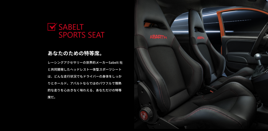 レーシングアクセサリーの世界的メーカーSabelt社と共同開発したヘッドレスト―体型スポーツシートは、どんな走行状況でもドライバーの身体をしっかりとホールド。アバルトならではのパワフルで情熱的な走りを心おきなく味わえる、あなただけの特等席だ。
