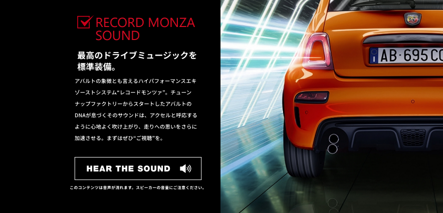 アバルトの象徴とも言えるハイパフォーマンスエキゾーストシステム“レコードモンツァ”。チューンナップファクトリーからスタートしたアバルトのDNAが息づくそのサウンドは、アクセルと呼応するように心地よく吹け上がり、走りへの思いをさらに加速させる。まずはぜひHPでご視聴を。